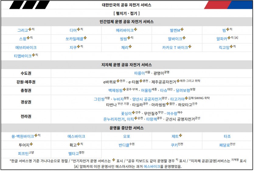 대부분 중국 업체의 기기를 사용하는 공유 킥보드와 달리, 국산 업체와 중국 업체의 기기가 혼재되어 있으며, 국내 브랜드는 스미크, 알톤스포츠, 삼천리자전거, 벨로스타, 부릉이, 발켄 기종이 대부분이며, 중국 브랜드는 판다윈, 나인봇, 콰이룬, OKAI, 핏라이더 기종으로 운영 중이다. 부릉이, 발켄M과 같이 전기자전거를 판매하는 업체에서도 공유 자전거 서비스에 뛰어들고 있다.